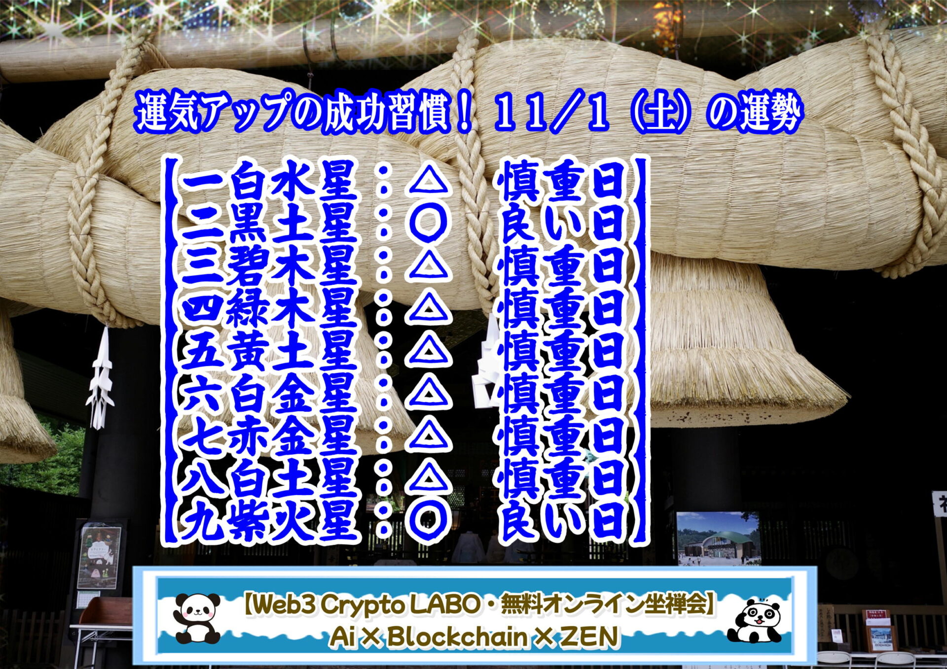●【神無月?】旧暦10月は「神無月」。全国の八百万の神々が「大国主大神」さまが鎮座する出雲大社に集い、“しあわせ”の御縁を結ぶ会議「神議(かみはかり)」がなされる故事に由来。出雲地方では旧暦10月を「神在月」と言い、11/3が神迎(かみむかえ)神事の「神迎祭」