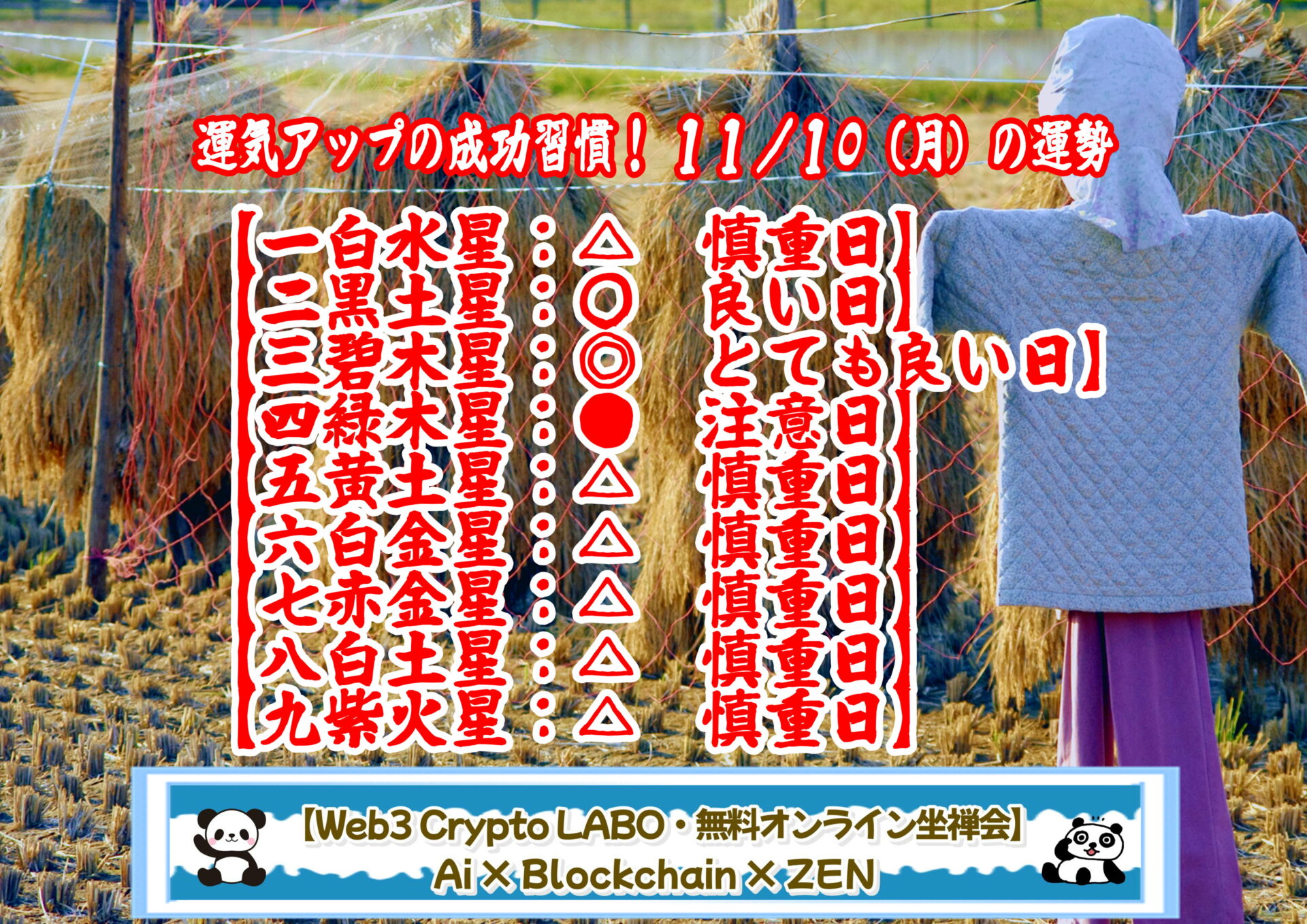 ●【かかしあげ?】十日夜(とおかんや)は旧暦の10/10に行われる収穫祭、地域によっては11/10。稲刈りが終わって田の神様が山に帰る日です。そして「かかしあげ」といって案山子と一緒にするお月見は、十五夜、十三夜、十日夜の3回。お月見すると運気が上がりますよ。